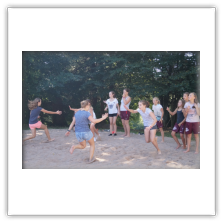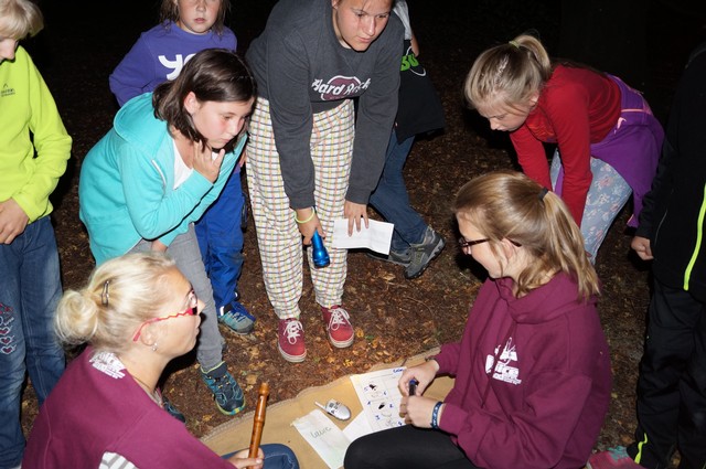 Unsere Aufgabe war es dann nach dem Abendessen bei einem Nachtgeländespiel an verschiedenen Stationen Applauskärtchen zu sammeln und so die Schallplatten zurück zu erobern. Die Schwierigkeit war, dass die Stationen nur durch Geräusche zu erkennen waren. Wir mussten also sehr still sein und auf die Trillerpfeife, das Becken, die Flöte, den Schellenkranz und einige andere Instrumente hören und den Geräuschen folgen.