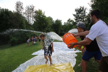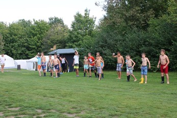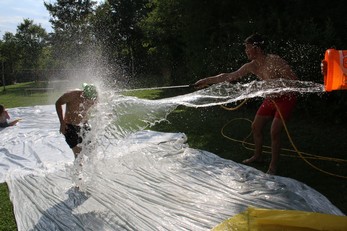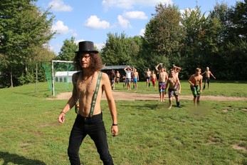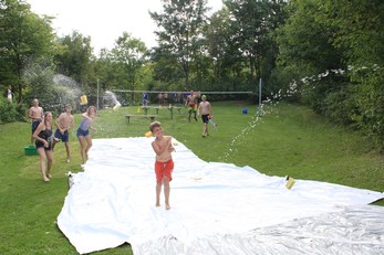 Nach dem Frühstück in ungewohnt pinker Umgebung stand wieder ein Spiel an. Wir mussten für Hairycane und Eisenherz Aufträge erfüllen, da diese alle Hände voll zu tun haben. Also mussten wir in Gruppen von Händler zu Händler rennen um die zu den Aufträgen zugehörigen Artikel einzukaufen und vor den Bösewichten wegzurennen. Natürlich hörten wir auch wieder eine Geschichte von Hairycane: Eisenherz und er wurden vom Geheimrat gefangen genommen und an den Pranger gestellt. Anschließend wurden sie von diesen verspottet. Irgendwann holt Hairy tief Luft und bläst die Schurken weg. Eisenherz und Hairycane können sich befreien und suchen das Weite. Nach dem Mittagessen, heute Kässpätzle mit Röstzwiebeln, stand das Geheimratseckenspiel auf dem Plan. Der Geheimrat, sprich die Bösewichte, haben die Wasserversorgung der Stadt gekappt und wir mussten die Wasserversorgung sichern. So mussten wir in unseren Gummistiefeln Wasser schmuggeln oder durch einen Wasserparkour laufen. Am Ende gab es das große Finale, die Spritzpistolen und die Eimer wurden rausgeholt und es endete in einer großen Wasserschlacht. Sehr zu Freuden unserer Materialmitarbeiter, denn der Pool war endlich leer und konnte abgebaut werden. Danach ging es noch kurz für alle in den See.