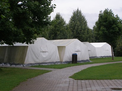 Und in diesen großen Zelten schlafen wir auf Feldbetten gemeinsam mit unserer Zeltgruppe.